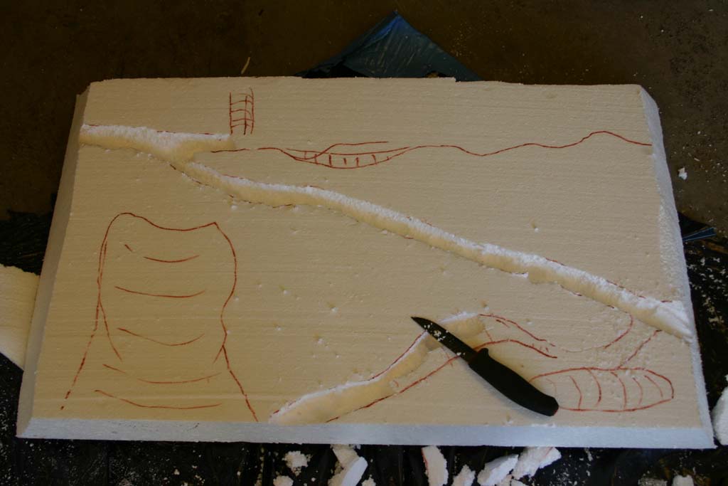 Här har jag ritat ut ungefär hur jag hade tänkt mig att bakgrunden skall se ut när den är klar samt börjat skära/bryta loss bitar från skivan